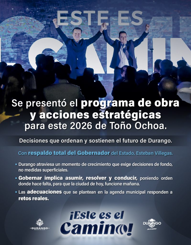 04 - Feb - 2026 Nacional Auditorías en tiempo real o tragedias anunciadas: Vero Pérez febrero 4, 2026 Economía Pemex reduce su deuda 20% respecto a 2018, febrero 4, 2026 Deportes ¡Durango imparable! Coronelas suma 5 victorias y sigue invicta febrero 1, 2026 Regional Calles olvidadas, hoy pavimentadas: Toño Ochoa cumple febrero 4, 2026 Local Estudiantes cierran filas con Toño Ochoa: “Durango es el camino” febrero 4, 2026 Instagram Según @pollsmx así el #ranking de los estados dond Diálogo y orden: Toño Mier encabeza Mesa de Paz • Durante una misa tranquila, el padre estaba dando 💊⚠️ Vero Pérez (PAN): “La crisis de medicamentos p Una historia de amor para el mes del amor Hace 7 La misión Artemis II está a la vuelta de la esquin Lo mejor para disfrutar este Súper Bowl está en el 🩺⚠️ Durango enfrenta alta prevalencia de diabetes, Síguenos en Instagram Tik Tok Recientes Economia y Finanzas Pemex reduce su deuda 20% respecto a 2018, Ver más » febrero 4, 2026 Nacional Auditorías en tiempo real o tragedias anunciadas: Vero Pérez Ver más » febrero 4, 2026 Regional Calles olvidadas, hoy pavimentadas: Toño Ochoa cumple Ver más » febrero 4, 2026 Local Estudiantes cierran filas con Toño Ochoa: “Durango es el camino” Ver más » febrero 4, 2026 Nacional México acelera inversión pública: 722 mil millones extra Ver más » febrero 3, 2026 Local Predial con 15% menos en febrero: Durango aprieta pero apoya Ver más » febrero 3, 2026