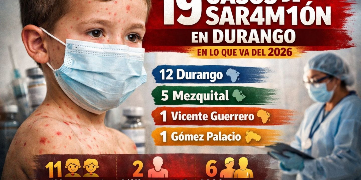 La Secretaría de Salud del Estado de Durango confirmó que, al corte del 5 de febrero de 2026, se han registrado 19 casos de sarampión en la entidad, con mayor incidencia en el municipio de Durango, donde se concentran 12 contagios. El resto de los casos se distribuye en Mezquital, con cinco; Vicente Guerrero, con uno; y Gómez Palacio, con otro más.