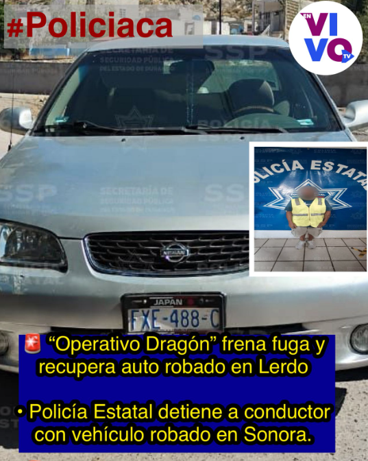 Durante el Operativo Dragón, agentes de la Policía Estatal recuperaron un vehículo con reporte de robo en la localidad de El Huarache, Lerdo, Dgo. El conductor, identificado como Gerardo “N”, de 53 años y originario de Torreón, intentó evadir un filtro de seguridad, pero fue interceptado tras una breve persecución.